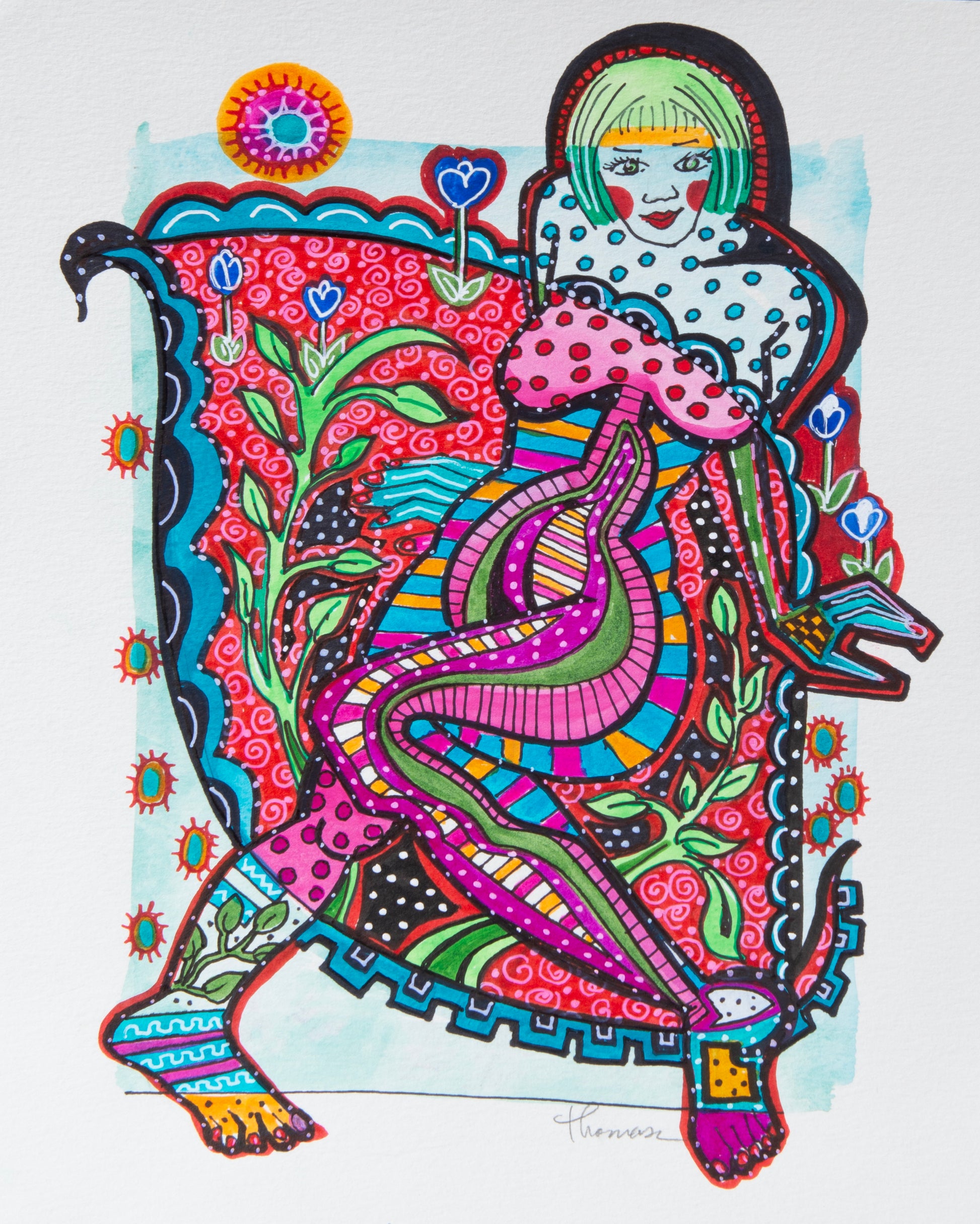 Bursts of color and dense patterns converge in this bold, dreamlike figure—half-human, half-symbol, caught in the tension between vitality and restraint. In Living in a Fasting World, the artist uses watercolor and ink to create a swirling, almost psychedelic tapestry of form and emotion. The female figure, wrapped in lush flora and surreal anatomy, gazes outward with quiet confidence. Her segmented body suggests fragmentation—perhaps a commentary on identity, consumption, and bodily autonomy in a world of imposed control.