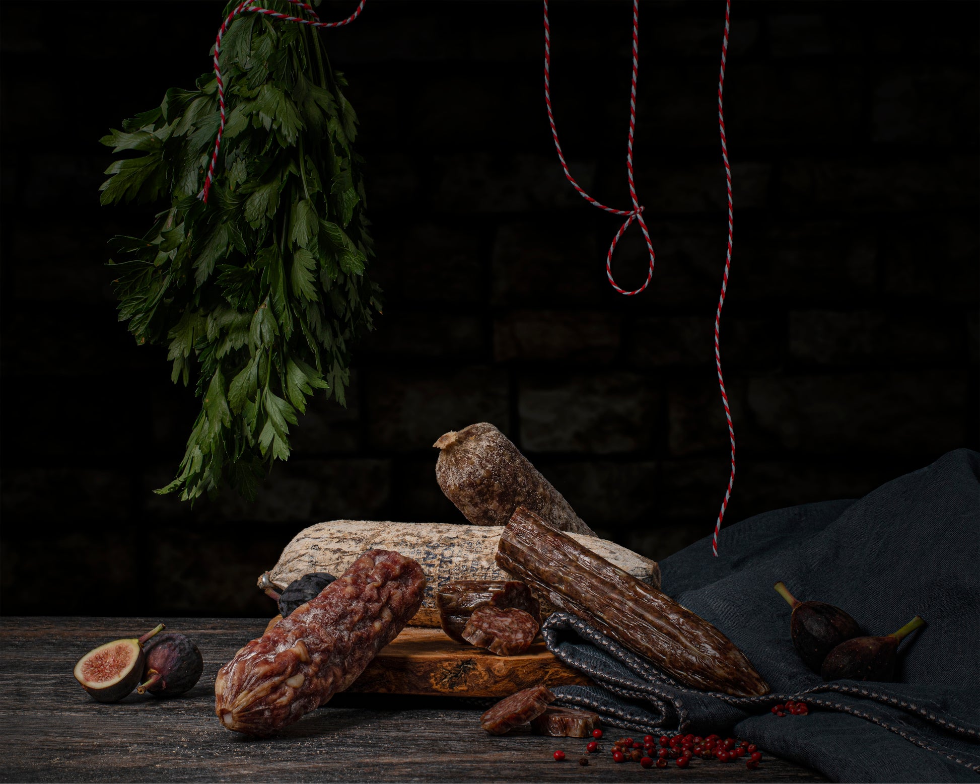 A study in preservation and tradition, Serva Cibum captures the quiet reverence of old-world craftsmanship. A bundle of fresh parsley, suspended in time, hangs above a rustic arrangement of aged cured meats—each piece bearing the marks of slow preparation and care. Nestled among fig halves and scattered peppercorns, the tableau is a homage to sustenance, seasonality, and the enduring art of the charcutier. Earthy textures, moody shadows, and rich, organic tones evoke the cool hush of a cellar where flavors deepen and history lingers.