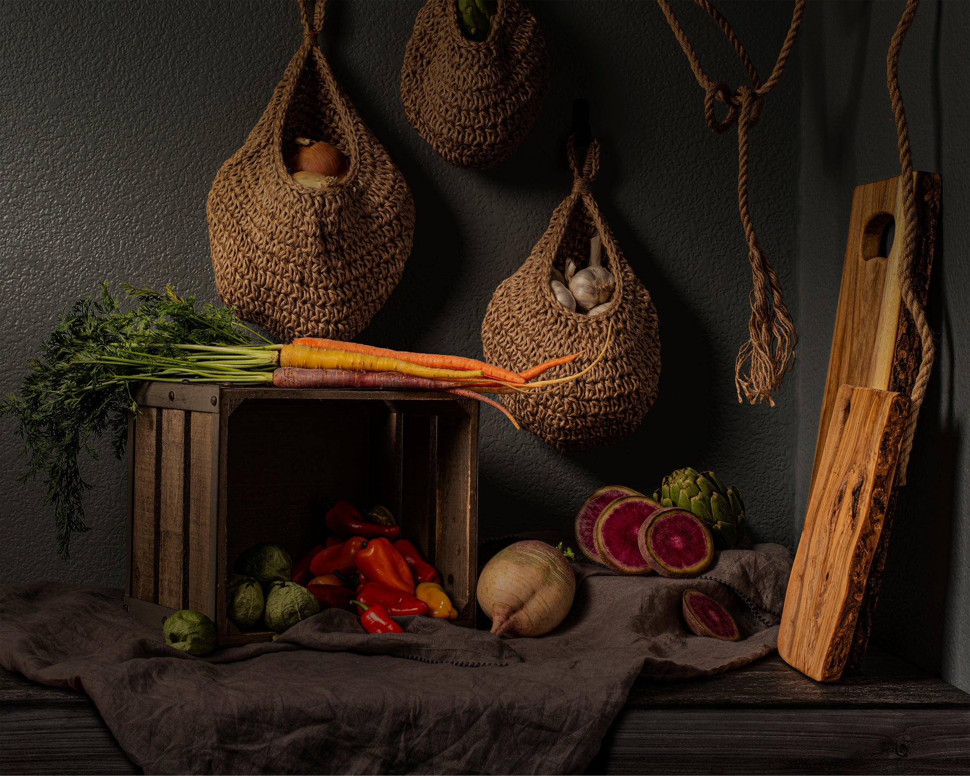 A quiet celebration of sustenance and simplicity, Radix Cellarium invites the viewer into the hushed stillness of a storied pantry. Root vegetables—vivid carrots, turnips, and striking watermelon radishes—rest alongside a crate brimming with peppers and tomatillos, their colors whispering of soil and sun. Woven baskets cradle garlic and onions, suspended like sacred offerings on textured walls, while a handcrafted cutting board leans patiently nearby. This tableau, both humble and artful, speaks to ancestral rhythms—of harvest, preservation, and the timeless poetry of food as nourishment, ritual, and home.