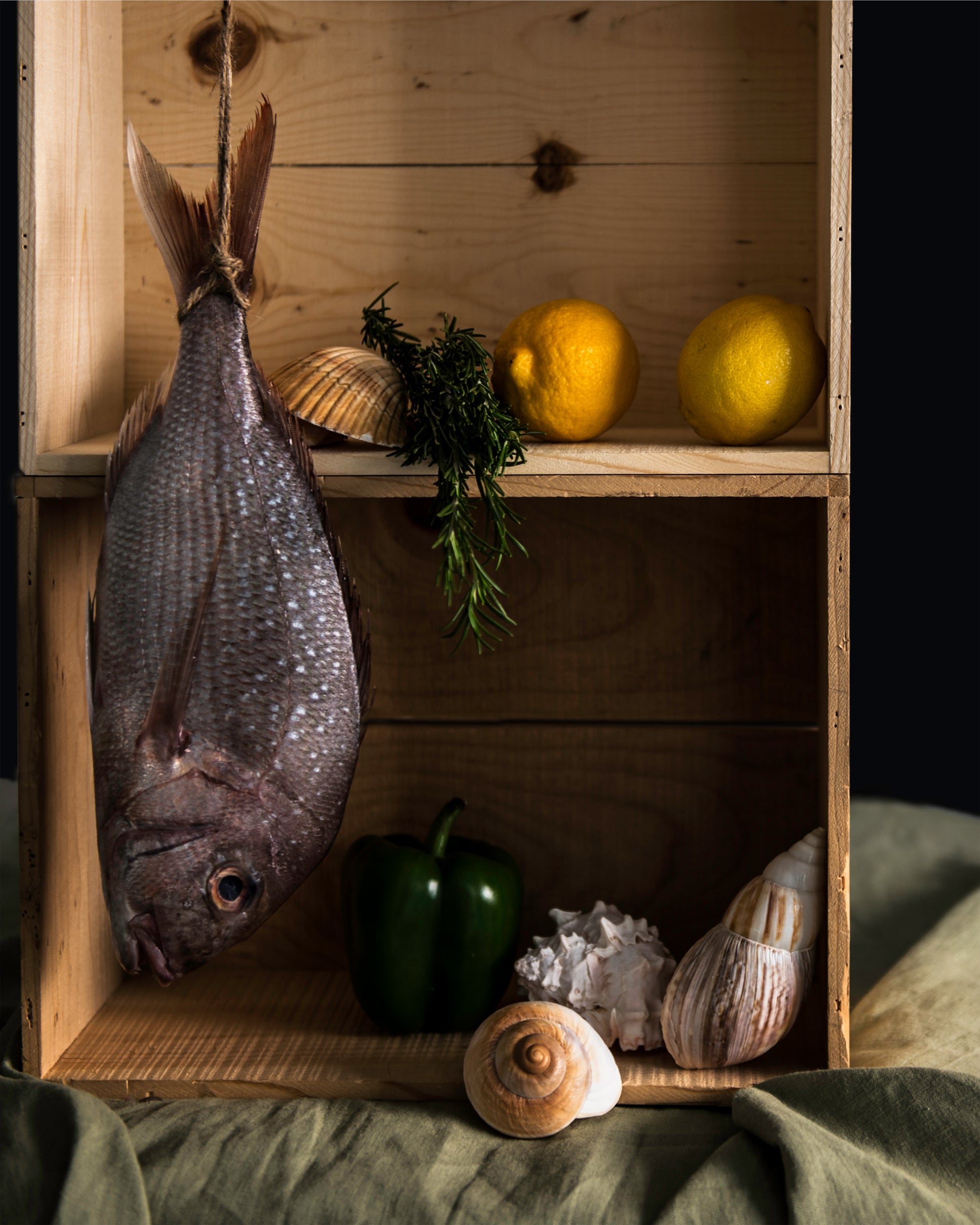 Piscis is a bold homage to classical still life traditions with a modern edge. A freshly caught fish hangs from twine in a wooden crate, surrounded by vibrant lemons, rosemary, sea shells, and a green bell pepper. Each object is carefully placed, creating a raw yet curated scene that invites the viewer to contemplate the beauty of nature, food, and the sea.