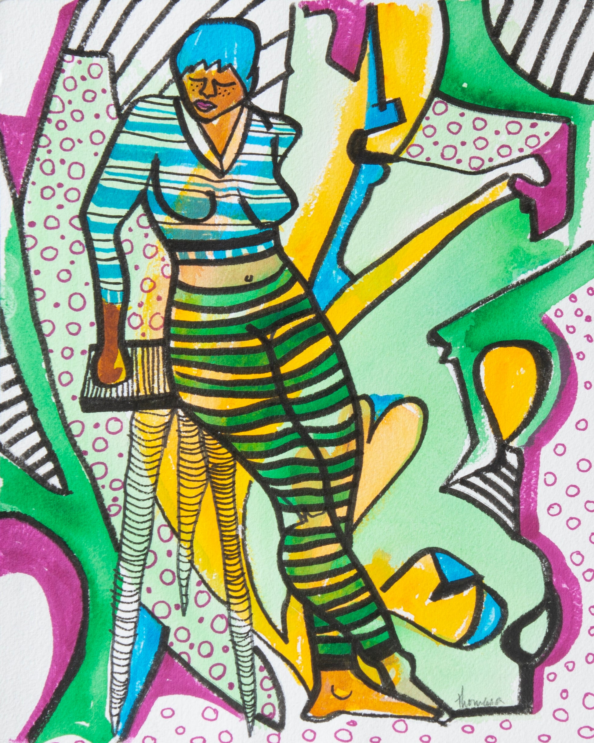 A bold yet serene figure stands at the center of swirling color and line. With striped clothing and blue hair, she embodies quiet confidence in a chaotic world. The vibrant forms around her suggest inner strength amidst disorder—a beauty that doesn't shout, but holds its own power in stillness.