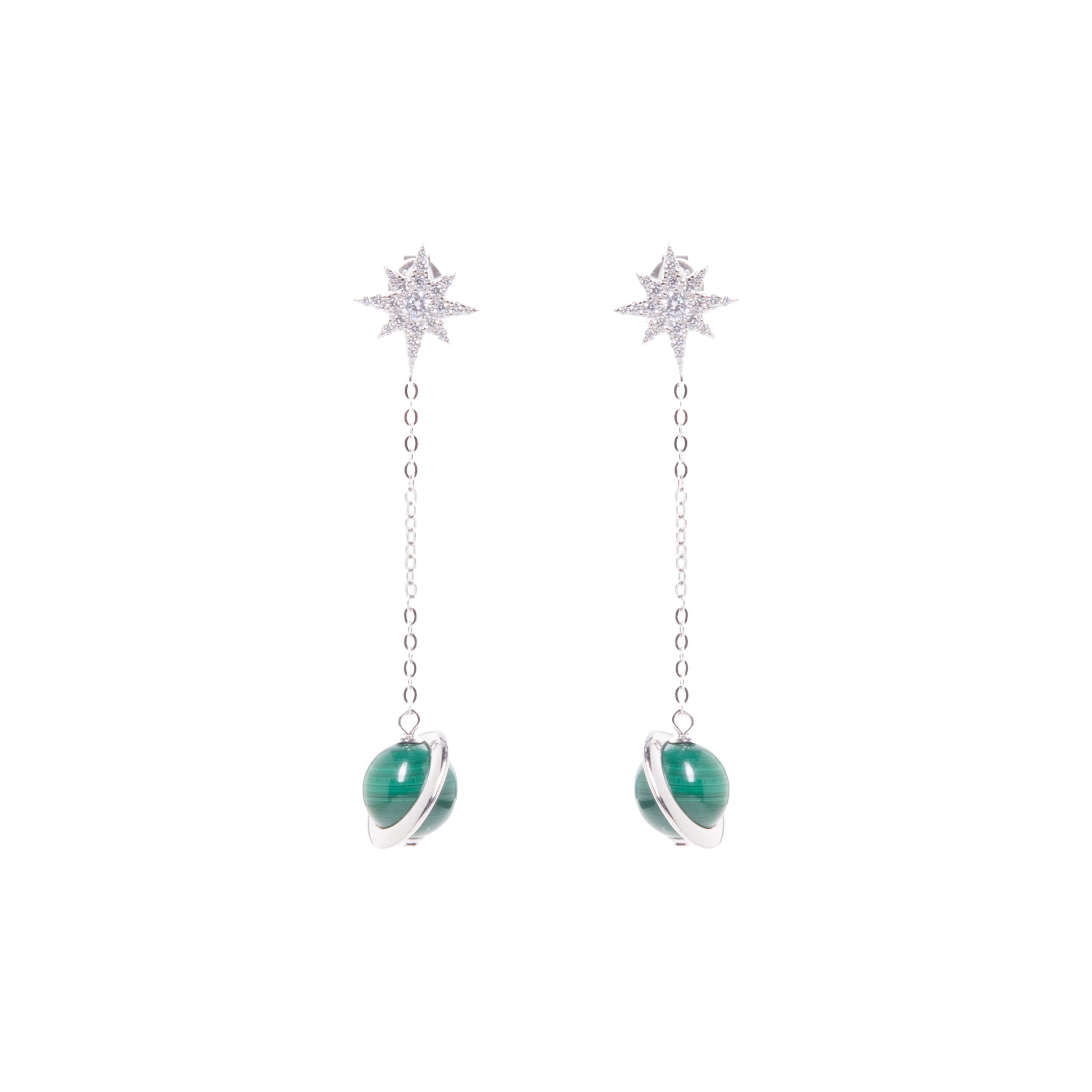 Elevate your style with our stunning Space Dangle Earrings. Featuring a gorgeous Malachite stone setting adorned in a delicate planet design, these earrings exude elegance and sophistication. The stars add a touch of celestial charm, making them the perfect accessory for any occasion.